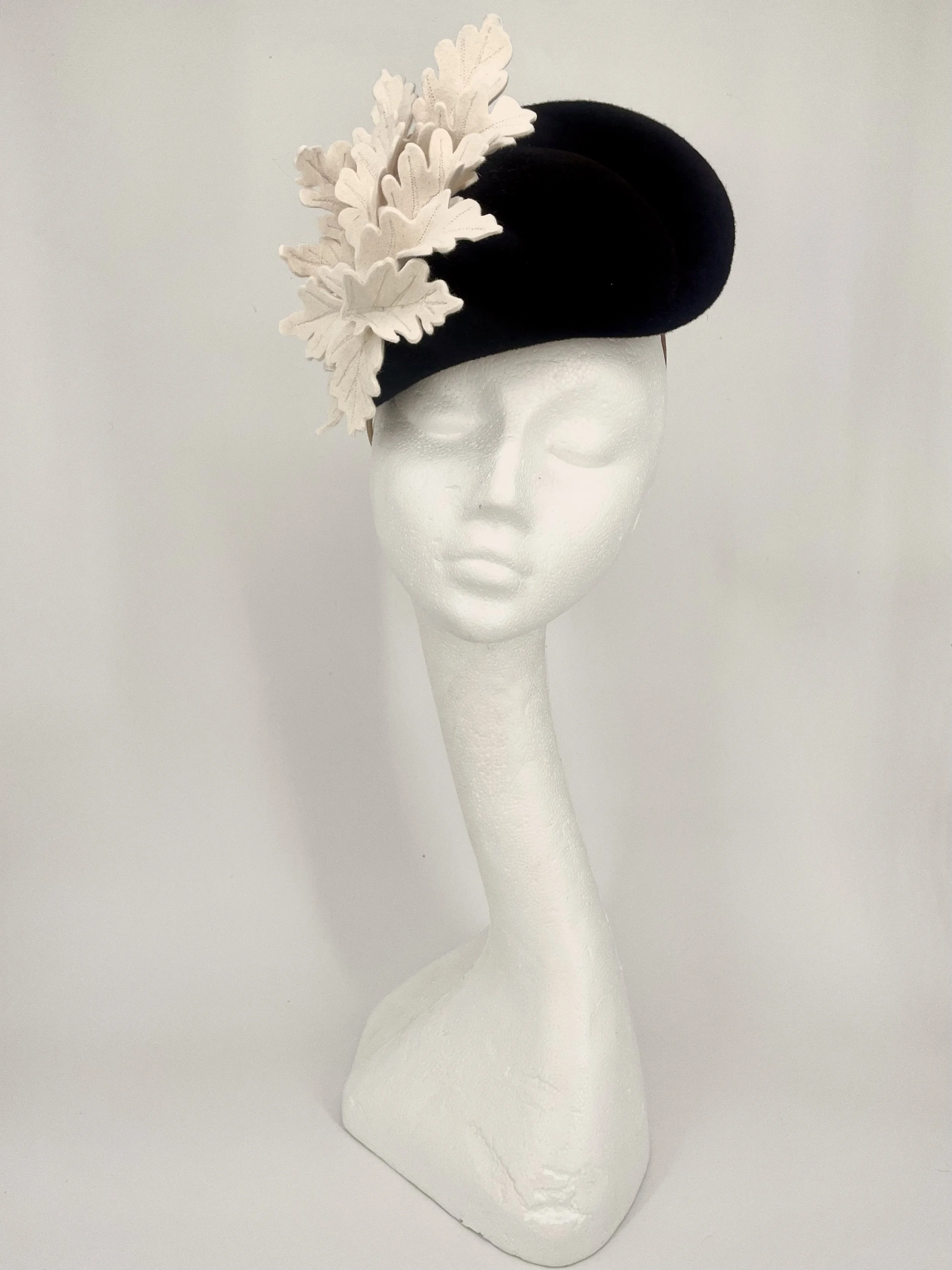 Burnt orange felt button hat with sculpted, cut felt leaves, beautifully arranged and paired with a curled ostrich quill.